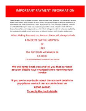 Please be aware of the significant increase in cybercrime and fraud. Whenever you receive bank account details from Lambert Smith Hampton by email you are strongly encouraged to verify the authenticity of those details by phoning our Auction Accounts Team on 02380 461643. If you receive an email purporting to be from someone at Lambert Smith Hampton which seeks to direct a payment to a bank, details for which differ from those which we have previously given to you, it is unlikely to be genuine. We do not accept any liability for monies sent to a bank account which is not an authentic Lambert Smith Hampton bank account.