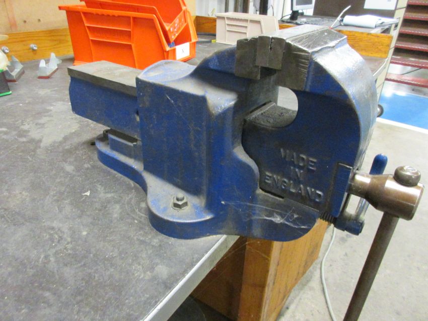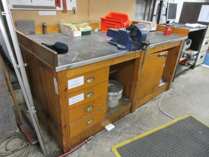 Timber 4 drawer/1 cupboard workbench, 2 x 1m, with Record No. 23 bench vice, 110mm