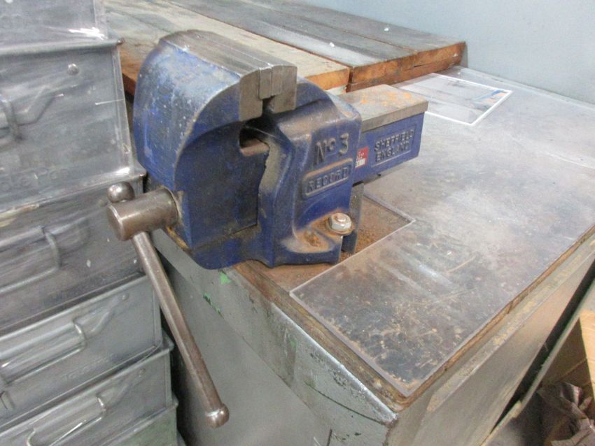 Metal frame mobile workbench, 1820 x 720mm with Record No. 3 bench vice, 4"