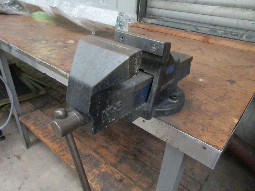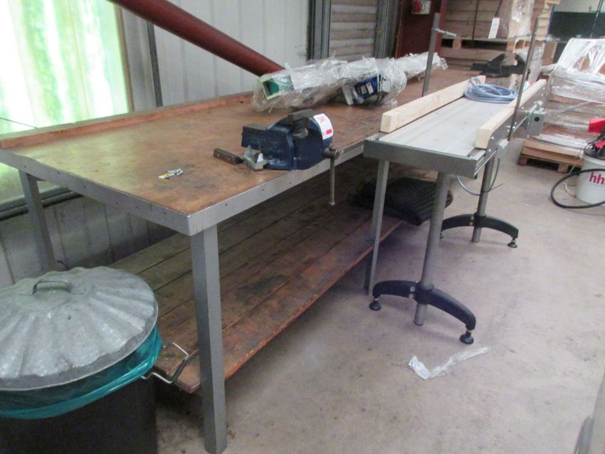 Metal frame/timber top workbench, 3.6m x 890mm with Record No. 5, 5" and Record No. 3, 4" bench vices