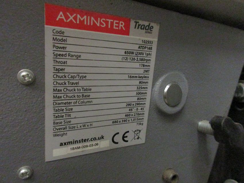 Axminster Trade Series bench top drill, model ATDP168, table size 290 x 290mm