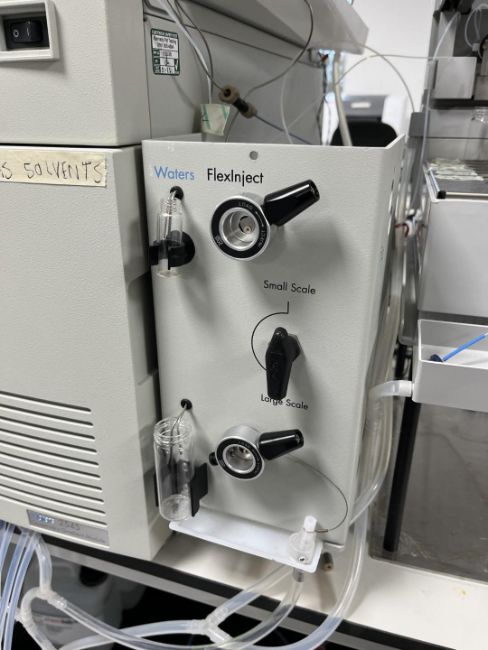 with Waters isocratic solvent manager (Serial No. E21QDI143m), Waters Acquity QDA detector (Serial no. KBD6269), Peak Scientific Solaris XE Nitrogen Generator (Serial no. 721070696), Waters 2489 UV/ visible detector (Serial no. L1787E906A), Waters 2545 quatertrey gradient module (Serial no. E1745Q716M), Waters Flow Splitter, Waters Flexinject and Waters fraction Collector III (Serial no. D18WFC782J)