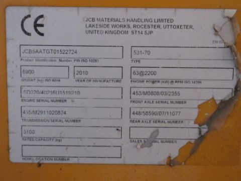 JCB 531-70 telehandler, ID JCB5AATGT01522724 (2010), rated capacity 3100kg with CAM 6ft bucket - quarter glass broken Use Reserved until 1pm Friday 14th February 2025 NB: This item has no record of Thorough Examination. The purchaser must ensure a Thorough Examination is carried out by a competent person prior to first use. The purchaser will be required to sign an undertaking confirming their agreement.