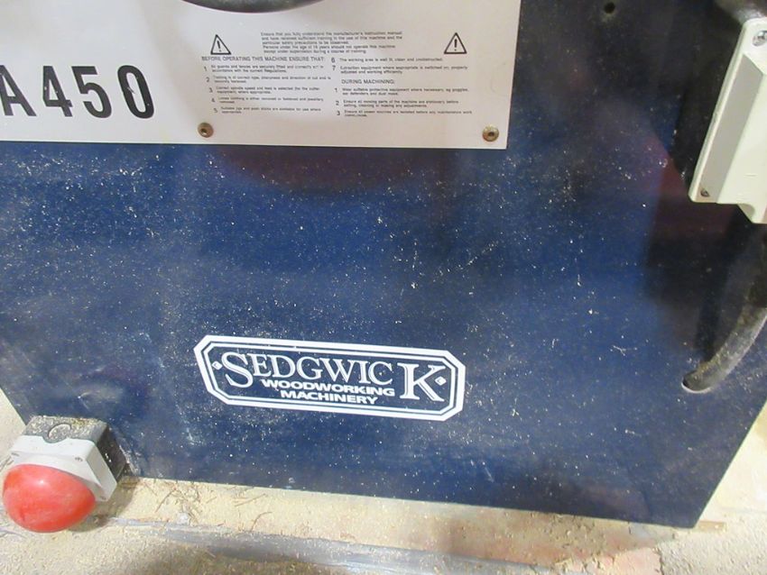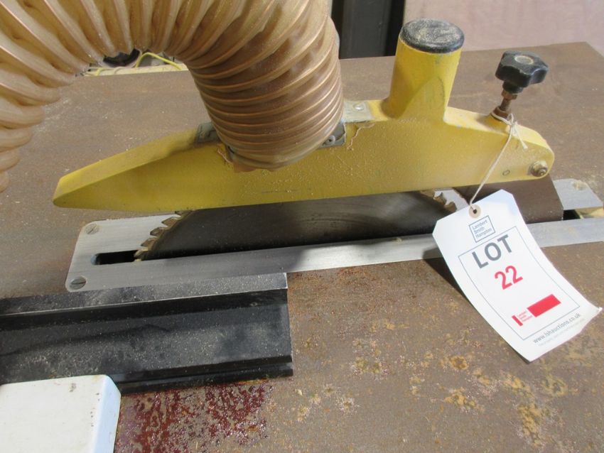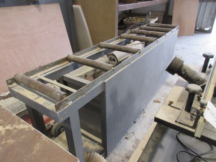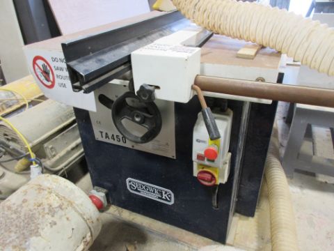 Sedgewick TA450 table saw bench with tilt arbour and gravity roller conveyor, 2.4m x 500mm
