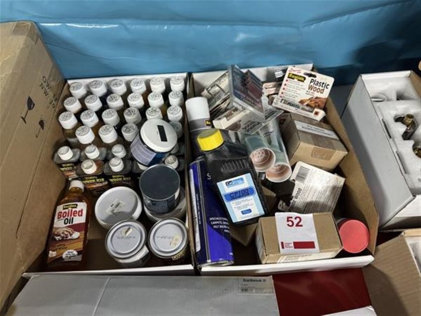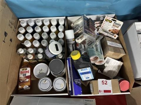 Two boxes of various wood dyes, plastic wood, leather colouring balm and wax filler sticks