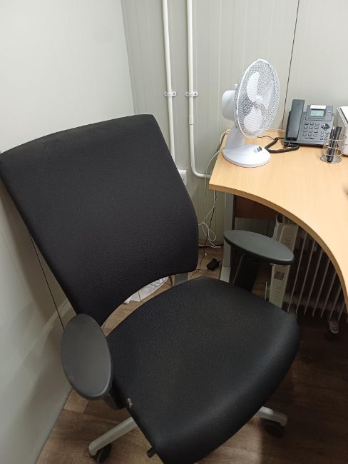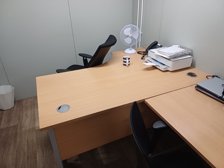 with 2 x oak effect radius office desks with 3-drawer desk high pedestal and mobile office chairs, oak effect cantilever office desk, JVC wall mounted LCD television, oil filled radiator, plus Zap insectocutor and desktop fan
