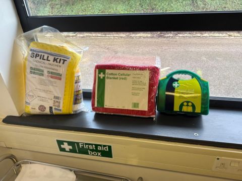Contents of first aid room to include medical bed, stainless steel trolley, first aid blanket, first aid kits and spill kits as lotted